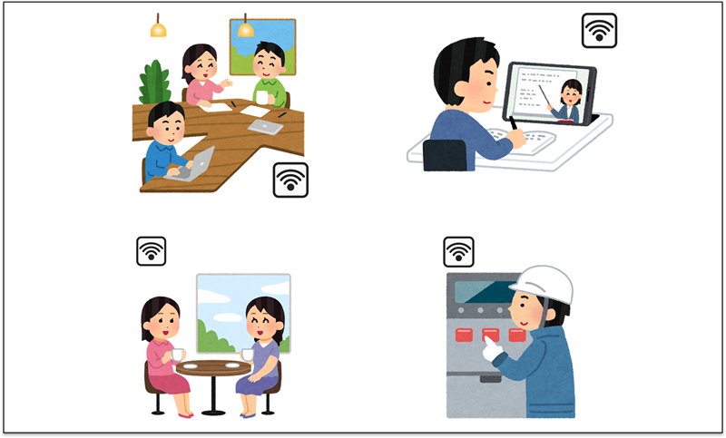 無線アクセスポイントは、オフィスや学校、イベント会場、カフェなど、多数のユーザーが同時にネットワークに接続する環境で活用されます。また、フロア内を移動して行う会議で用いるノートPCや、工場や倉庫で使われるIoT端末やセンサーなど、有線LANだけでは敷設や接続の柔軟性から対応が難しい状況においても利用されています。