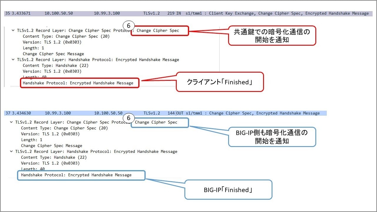 BIG-IPも「Change Cipher Spec」「Finished」を送り、以降は暗号化通信が開始されます。