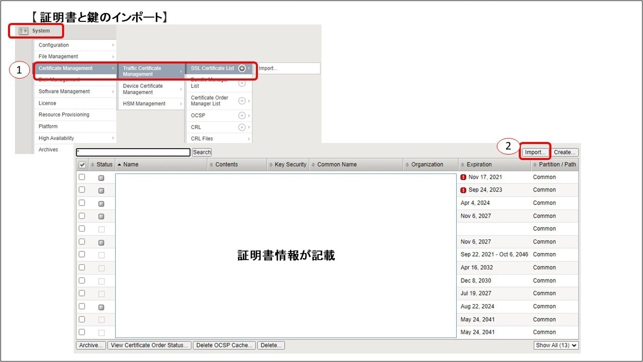 ①トップ画面からSystem > Certificate Management > Traffic Certificate Management > SSL Certificate Listの順に選択します。