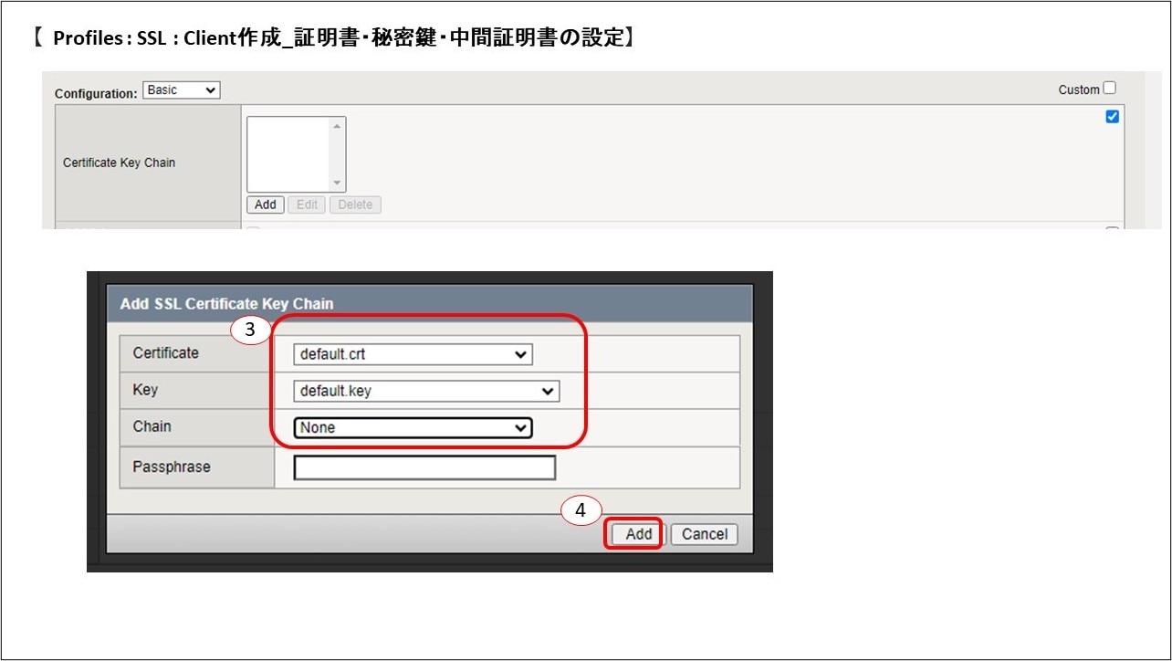 ③Addをクリックし、Certificateに先程Importしたサーバ証明書を、Keyに秘密鍵を、Chainに中間証明書を選択します。