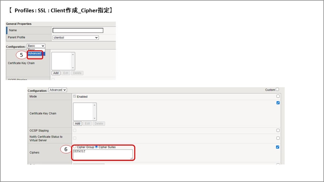 ⑤使用するCipherを指定する場合は、Configurationを「Basic」から「Advanced」に変更します。