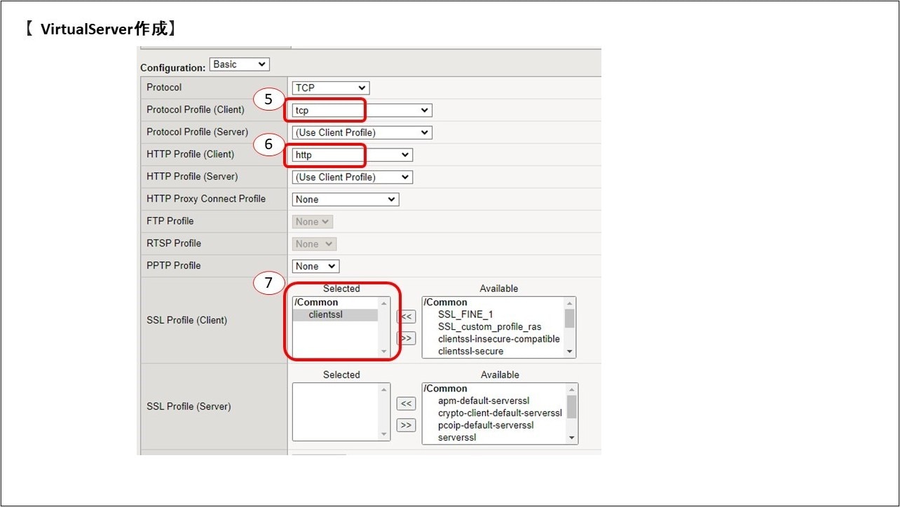⑦SSL Profile (Client)に先程作成したClient SSL Profileを選択し、AvailableからSelectedへ移動させます。