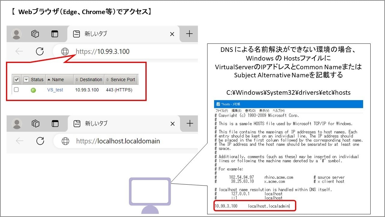 クライアントPCのブラウザから「https://<Common Name>」または、「https://<VirtualServerのIPアドレス>」へアクセスします。