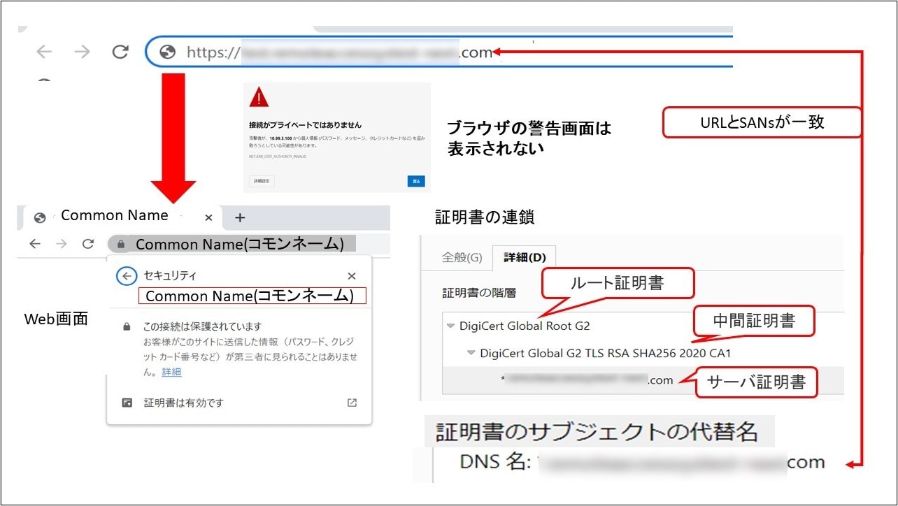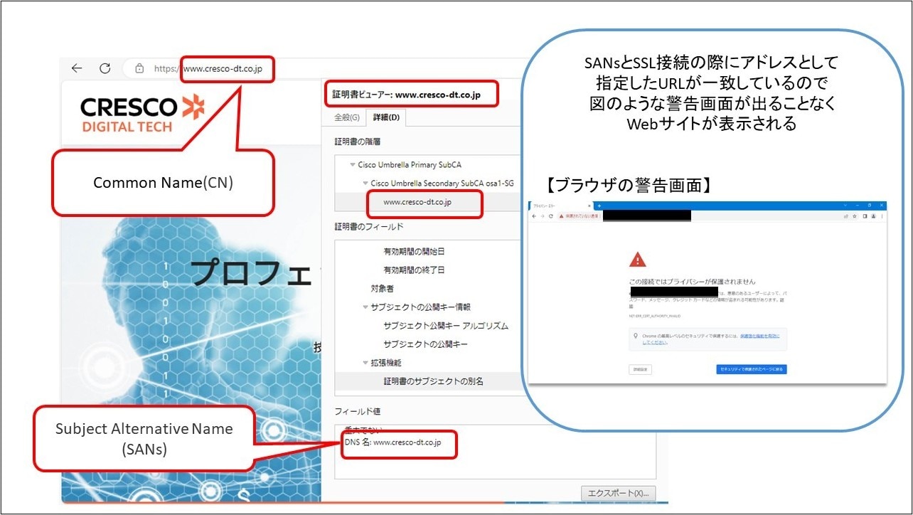 現在chrome等のブラウザは、SANsの設定がない場合はCommon Nameが設定されていても警告画面が表示されます。