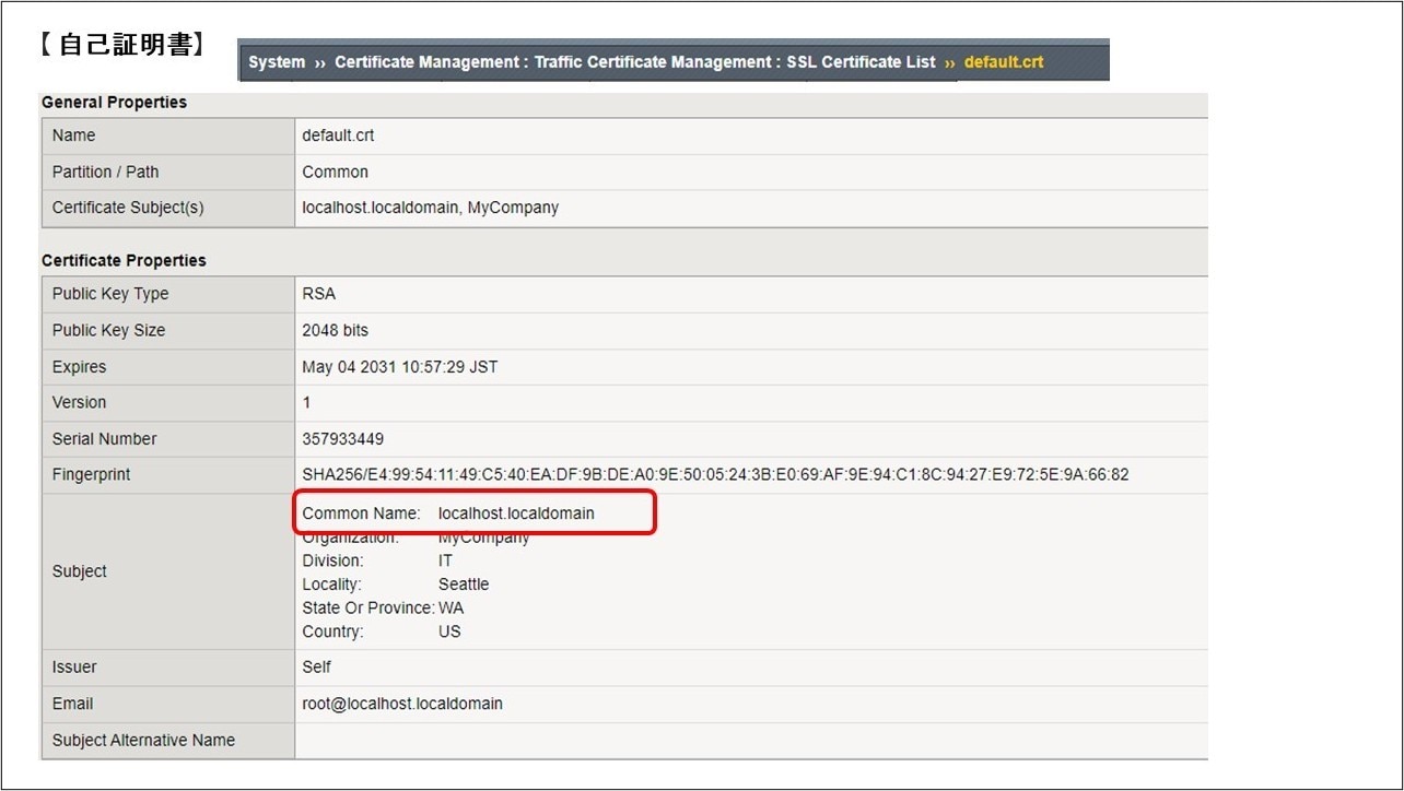 Common Name は、SSL接続をする際にブラウザにアドレスとして指定されるURLと一致している必要があり、指定したURLと、接続先Webサイトに設定されている証明書のCommon Nameが一致しない場合(例:VirtualServerのIPアドレスでアクセスする)、ブラウザは警告画面を表示させます。