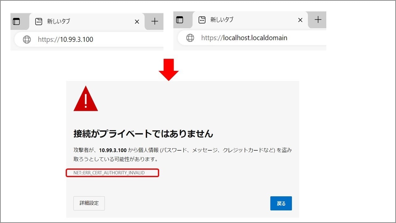 ブラウザアクセスすると次の図のような警告画面が表示される場合があります。「NET=ERR_CERT_AUTHORITY_INVALID」というエラーは、信頼された認証局から発行されたサーバ証明書を用いずにサイトを閲覧している場合に発生します。
