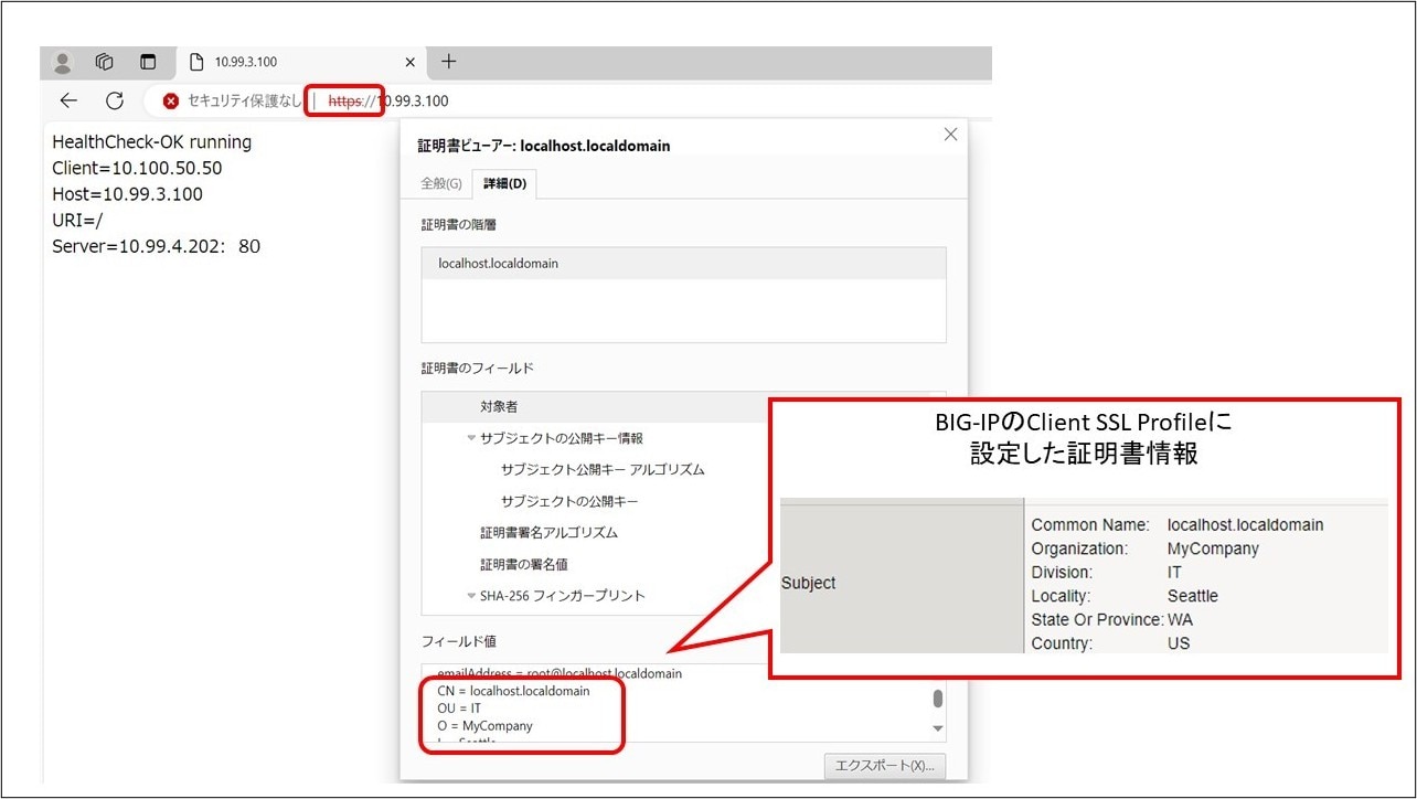 Client SSL Profileに設定したサーバ証明書(下画像は自己証明書)が表示されています。