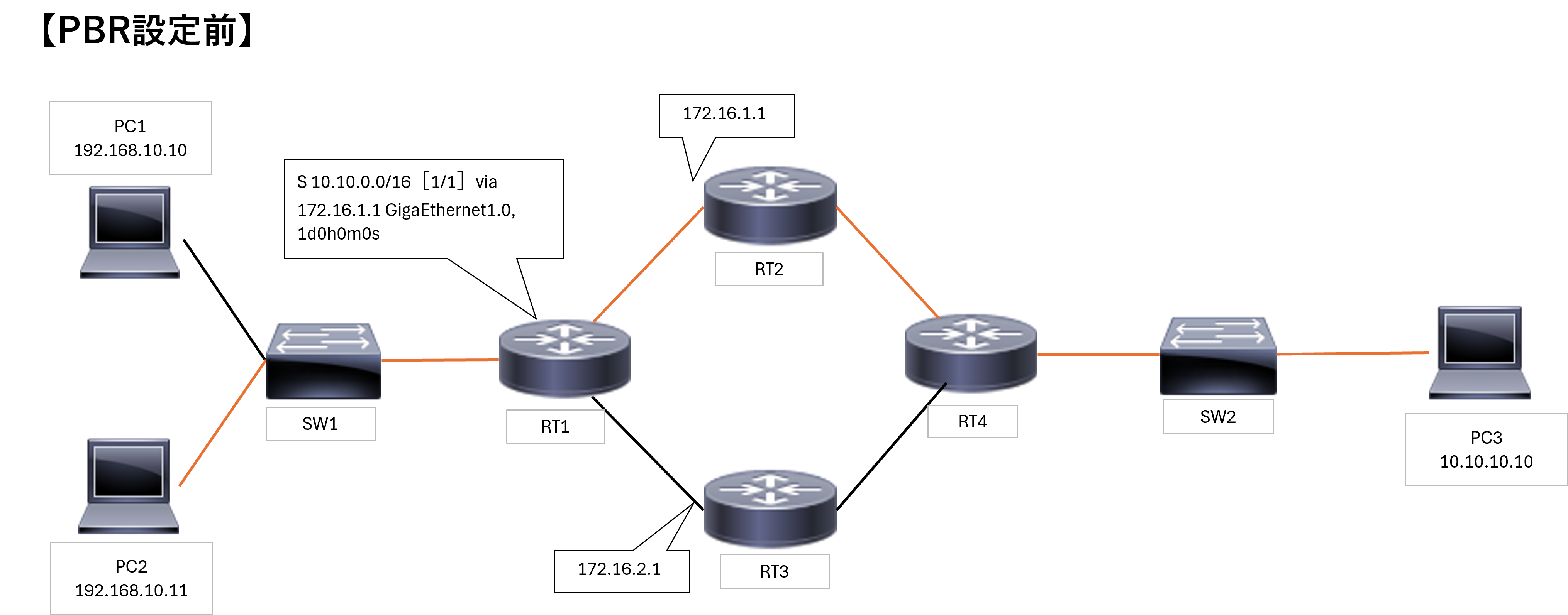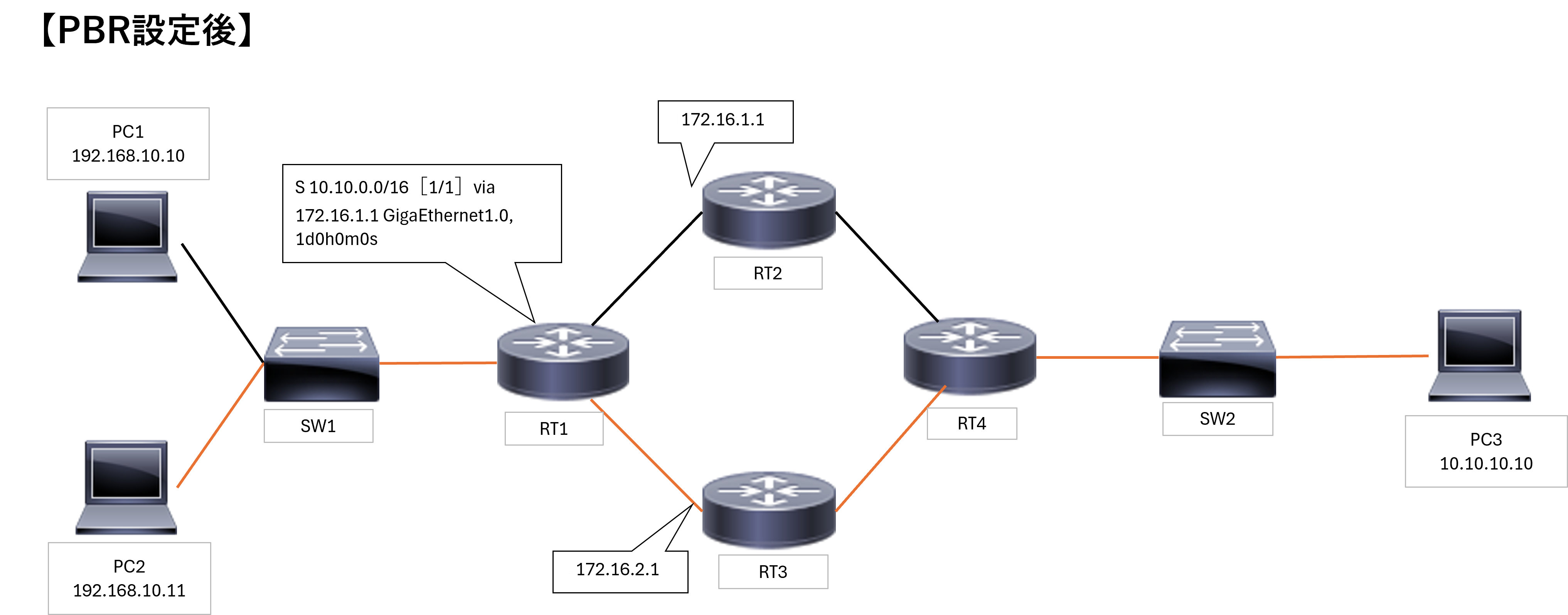 この設定により、送信元IP 192.168.10.11(PC2)からPC3への通信は指定した次ホップ 172.16.2.1(RT3)に転送されます。